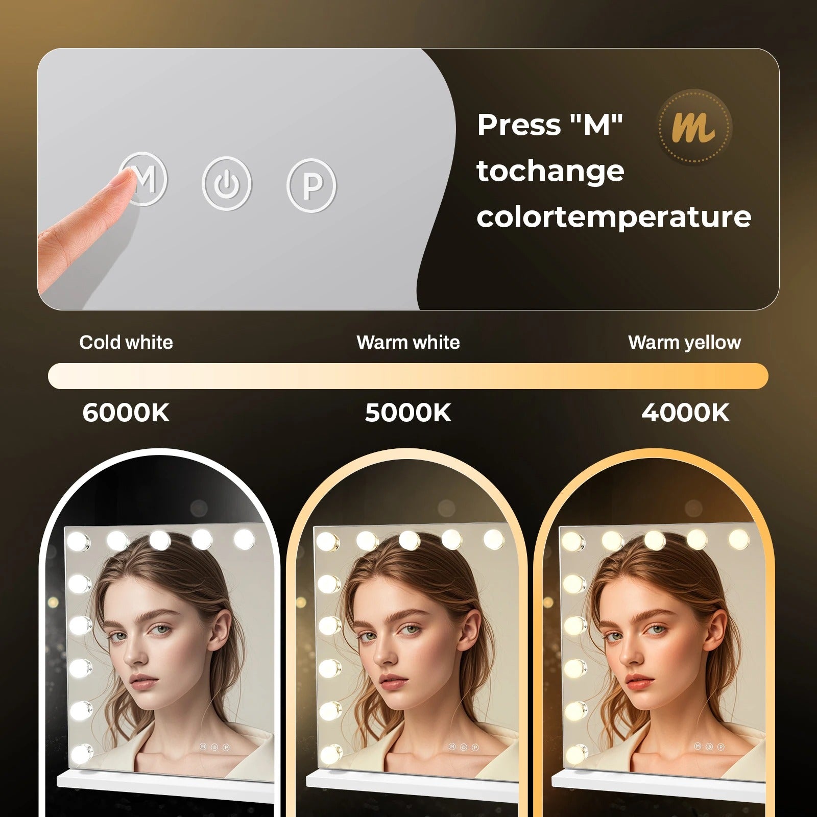 Featuring 18 bright LED bulbs that last over 50,000 hours, this vanity mirror offers three lighting modes controlled by simple buttons: use the "M" button to switch light colors, the middle button to power on/off, and the "P" button to adjust brightness. Plus, the handy memory function remembers your last light settings so you can pick up right where you left off.