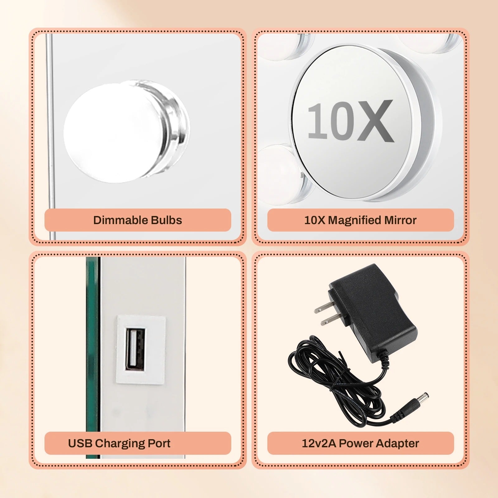 32"x24" Vanity Mirror with 18 Dimmable LED Bulbs – Large Hollywood Mirror 10X Magnified, 3 Color Modes & USB Charging Port - M004